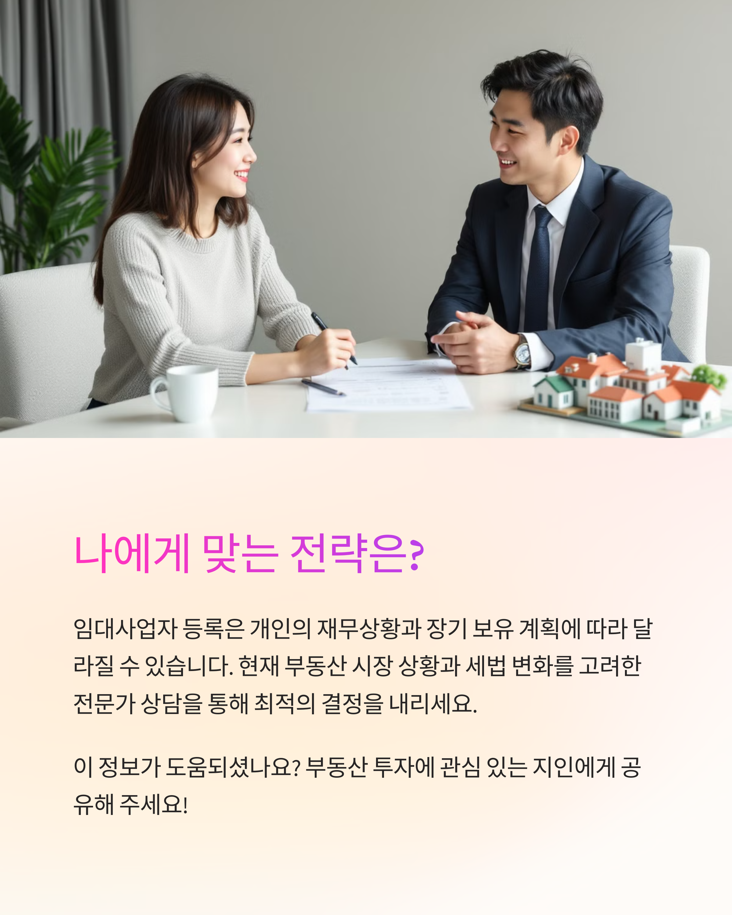 임대사업자 등록 여부를 결정하기 전에는 반드시 현행 법령과 개정 흐름을 면밀히 검토하고, 세무 전문가와의 상담을 권장합니다. 단순히 세금 혜택만을 바라보기보다는 중장기적 투자 전략에 따라 등록 여부를 선택해야 하며, 거주지역, 보유 주택 수, 전세 여부 등 구체적인 조건에 따라 결과가 달라질 수 있습니다.
