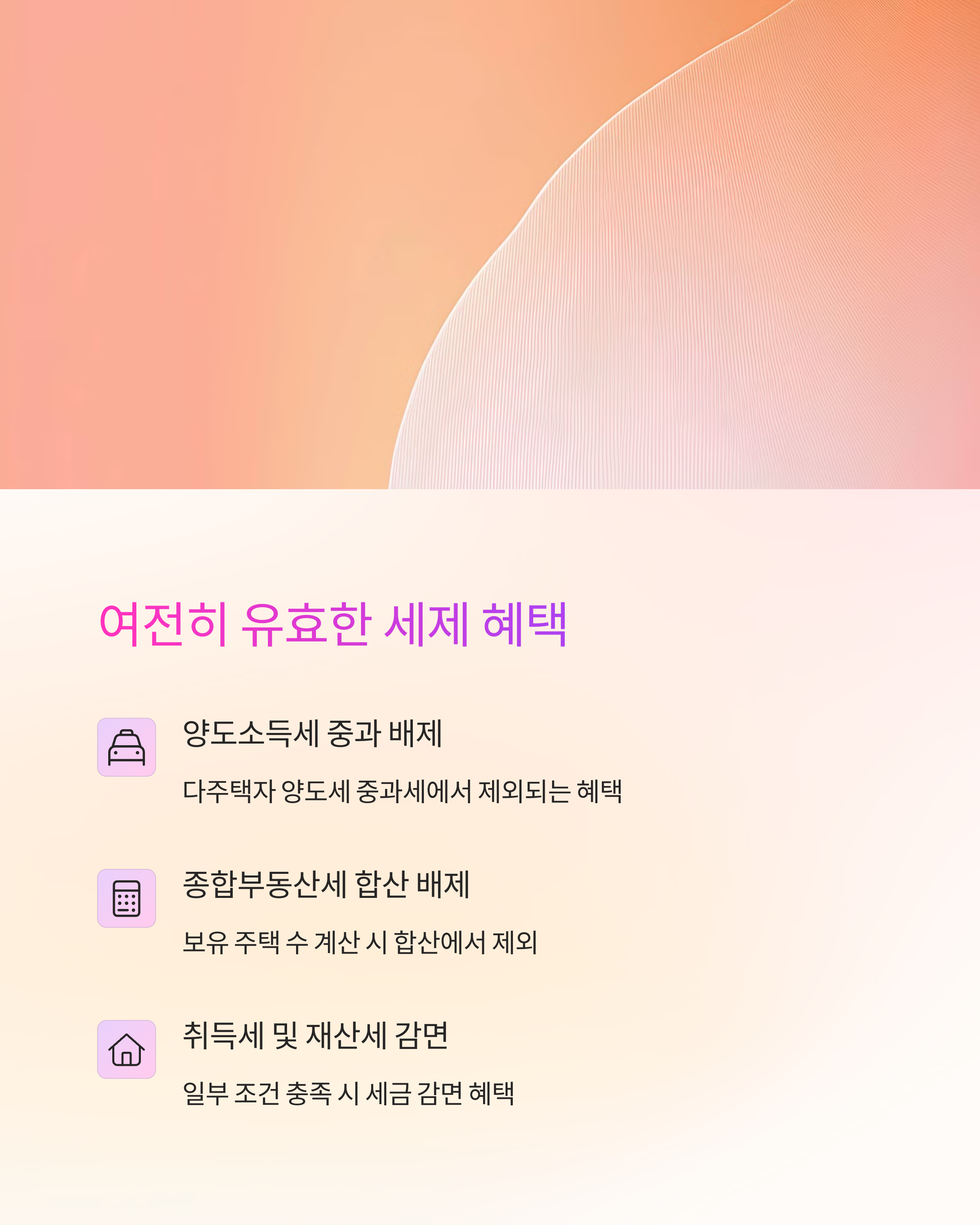 그럼에도 불구하고 일부 조건을 충족하면 여전히 유효한 혜택이 존재합니다. 대표적인 예가 양도세 중과 배제와 종합부동산세 합산 배제 혜택입니다. 예를 들어, 수도권 외 지역에서 기준시가 6억 원 이하 주택을 장기임대 등록할 경우 일정 세금 혜택을 받을 수 있습니다. 또한 지방자치단체의 정책에 따라 취득세 감면 등 지역적 인센티브도 제공되므로 자신의 보유 주택 유형과 위치에 따른 전략 수립이 중요합니다.