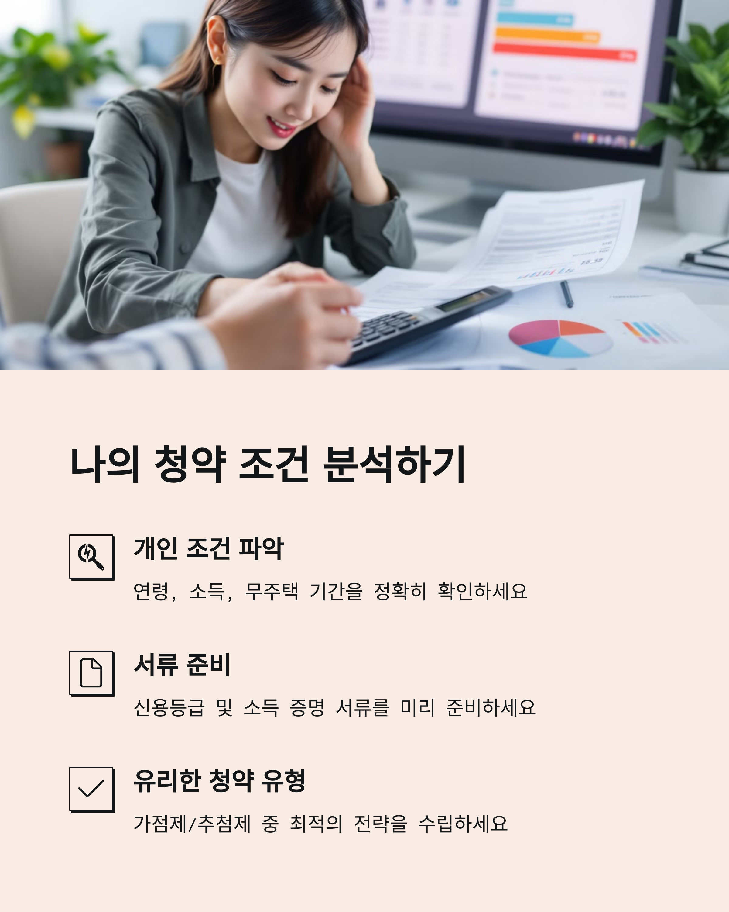 | 무주택·부양가족·청약통장 기간 관리 | 생애최초·신혼부부 등 조건별 접근 | 비인기 지역·개발 예정지 공략 |